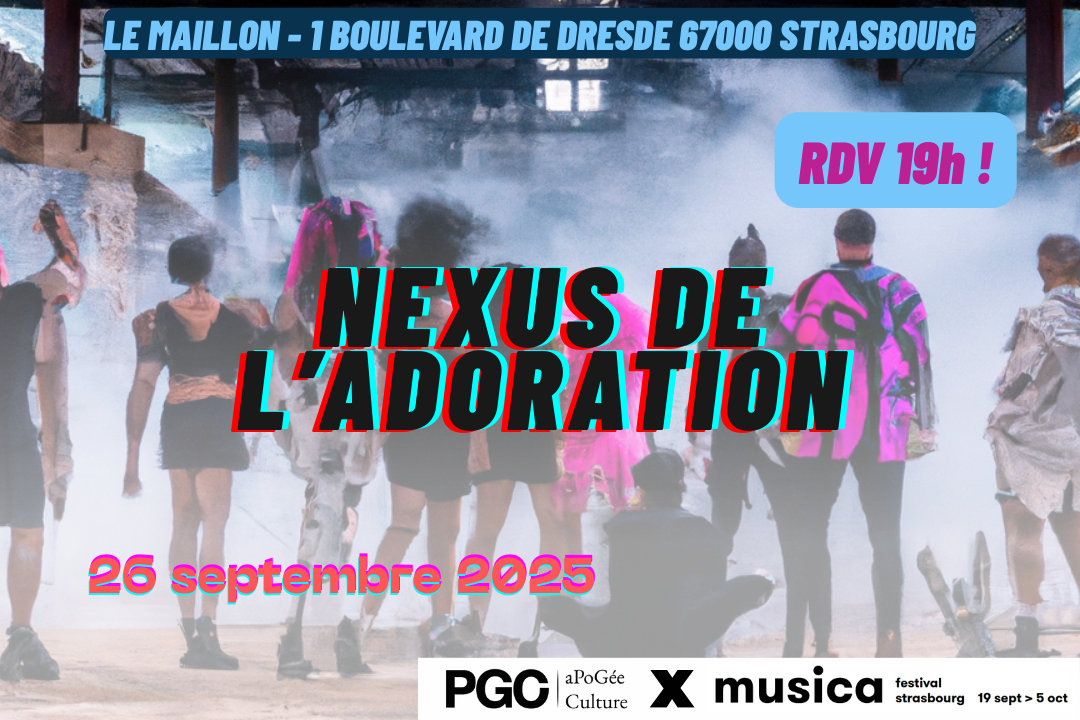Pour lancer en beauté la rentrée et en attendant l’arrivé du bureau 25/26, aPoGée a le plaisir de renouveler sa participation au Festival Musica. Cette année nous vous proposons – le vendredi 26 septembre au théâtre du Maillon – d’assister gratuitement à la représentation du spectacle Nexus de l’adoration mis en scène par Joris Lacoste ! Mais attention… On ne s’arrête pas là et on vous propose un petit extra avant le début du spectacle :