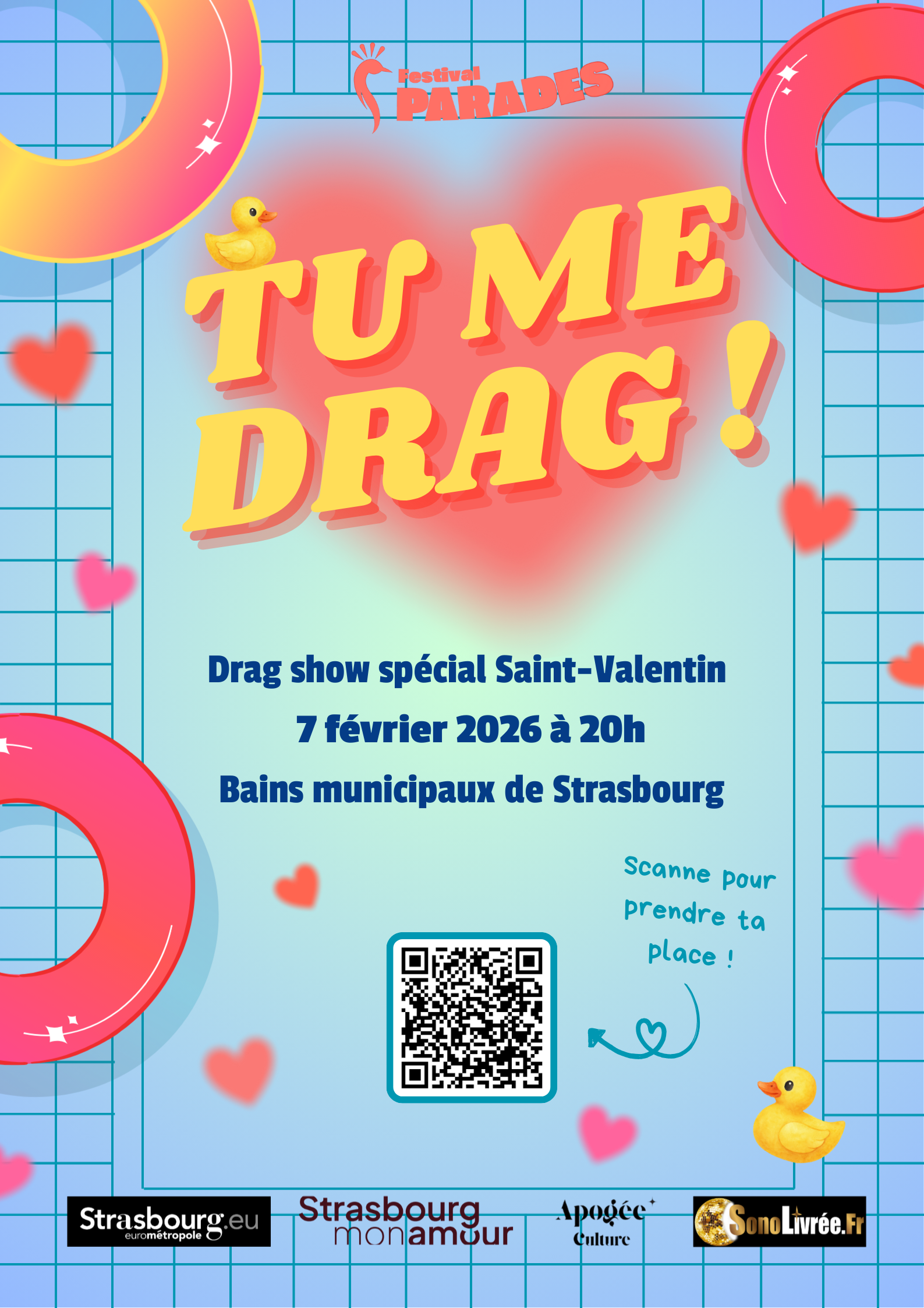 Avec TU ME DRAG !, les étudiants.es ont imaginé un drag show hors du commun, créé spécialement pour les Bains Municipaux de Strasbourg, classés monument historique. Dans le grand bassin de ce lieu patrimonial emblématique, le public assistera à un spectacle immersif, installé dans des bouées mises à disposition : une manière ludique et poétique de réinventer la relation entre scène, artistes et spectateurs. Labellisé par Strasbourg Mon Amour, l’événement explore les multiples formes de l’amour à travers de performances drag sensibles, engagées et profondément inclusives. Chacun.e de ces trois jeunes artistes se bat, au travers de ses performances, contre les discriminations intersectionnelles.